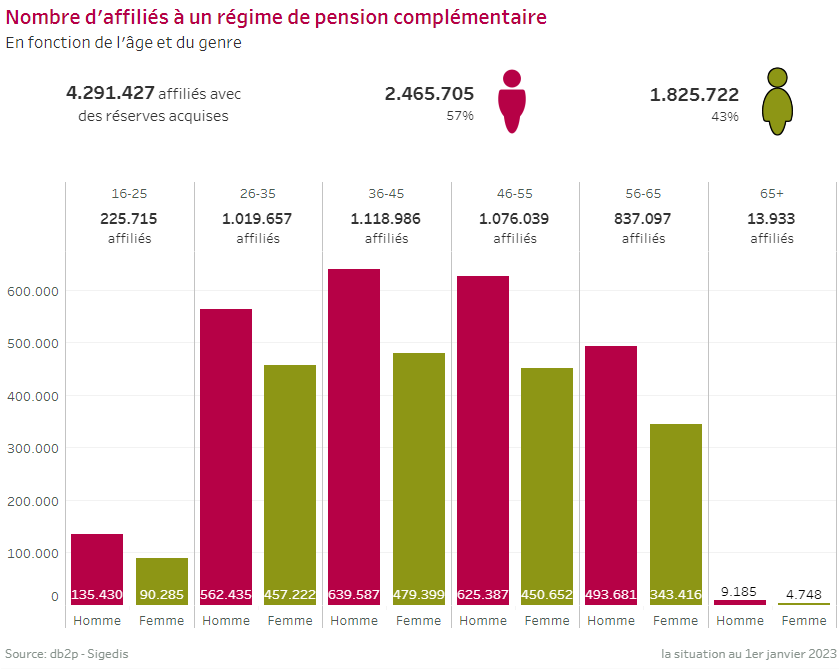 Au 1er janvier 2023, 4.291.427 salariés et indépendants étaient affiliés à un plan de pension complémentaire par l’intermédiaire de leur emploi actuel ou d’un emploi précédent. Cette pension supplémentaire leur est versée lorsqu'ils prennent leur pension.
