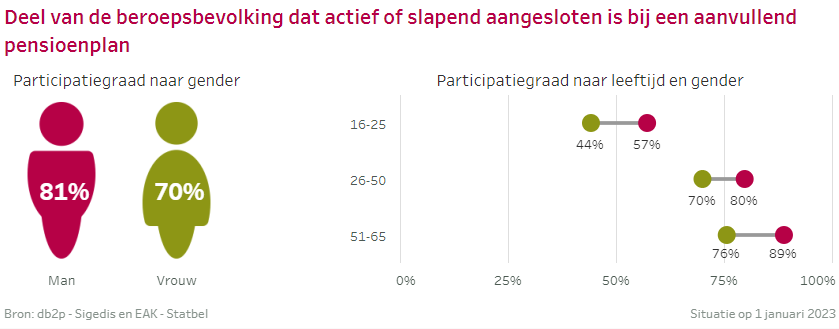 76% van beroepsbevolking bouwde al aanvullend pensioen op voor later. Dit zijn alle mensen die al ooit aanvullende pensioenrechten opbouwden (zowel actief aangeslotenen als slapers). En we vergelijken met de ganse beroepsbevolking; alle mensen tussen 16 en 65 jaar die in België wonen én werken of werk zoeken. De participatiegraad is lager bij vrouwen (9 procentpunt lager) dan bij mannen. Dat verschil zien we in elke leeftijdsgroep.