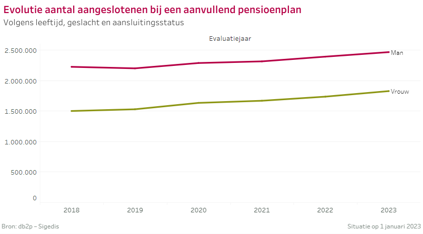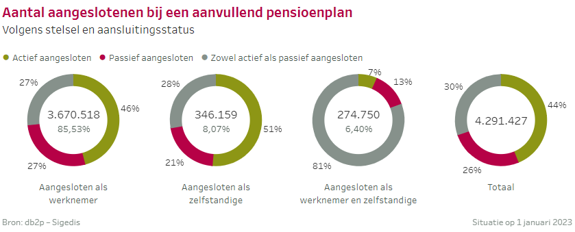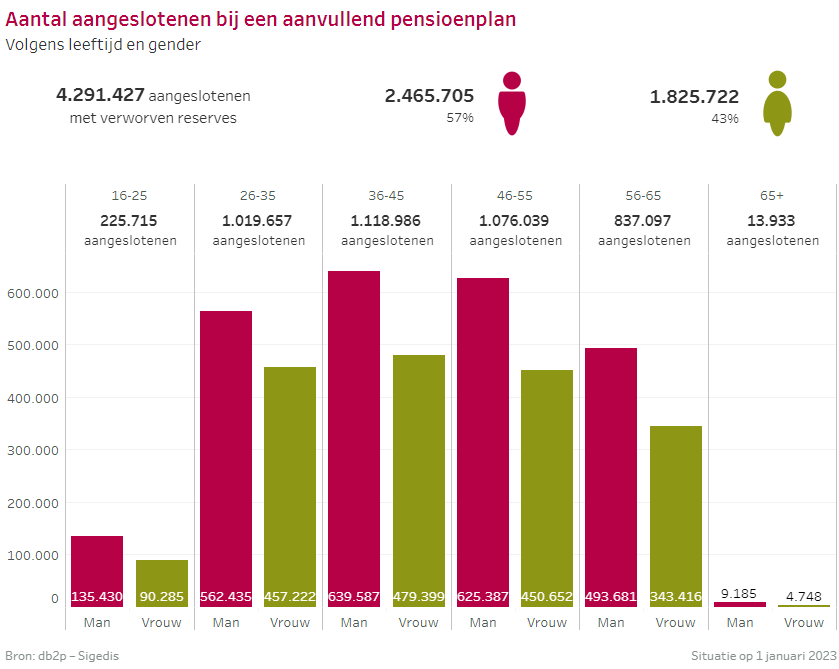 Op 1 januari 2023 waren 4.291.427 werknemers en zelfstandigen aangesloten bij een aanvullend pensioenplan via hun huidige job of via een eerdere job. Zij krijgen dit extra pensioen uitbetaald als ze op pensioen gaan.