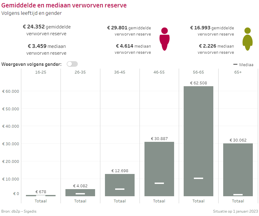 Evolutie aantal aangeslotenen bij een pensioenplanVoor alle 4,29 miljoen mensen met aanvullende pensioenrechten, bedraagt de gemiddelde verworven reserve € 24.352. De mediaan - of de verworven reserve van de middelste aangeslotene - ligt met € 3.459 duidelijk lager. Dat betekent dus dat de helft van de aangeslotenen tot nu toe een pensioenreserve spaarden van minstens € 3.459, de andere helft zit daar onder.